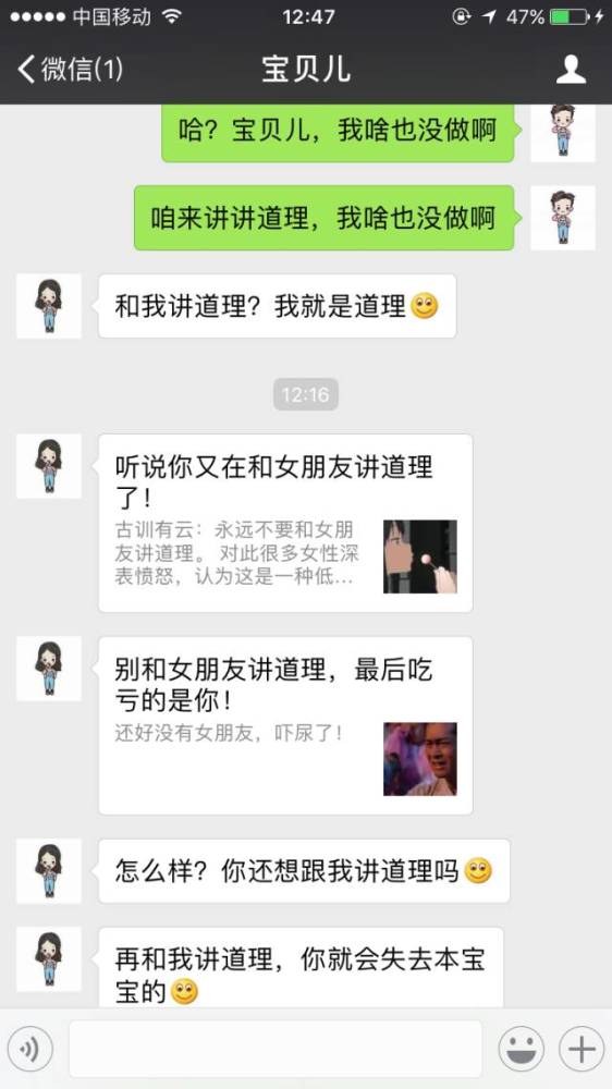 和女生摆道理,第一局完败。 不要和女朋友正儿八经的讲, 因为你极有可能瞬间变成单身汪。 别问狗哥怎么知道,不信你可以试试~ 女朋友就是最大的道理! 永远!永远!