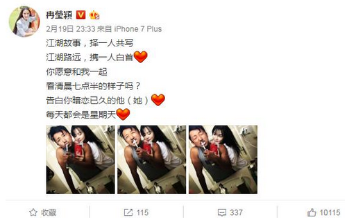 不过甜蜜的生活怎么可能只有邹市明一人晒呢?冉莹颖昨天就在微博上晒了自己和皱市明的恩爱照。虽然时间已经接近晚上十二点,但看得出来,冉莹颖对邹市明是真深情啊:先是表白说和邹市明白头到老,然后又说自己和邹市明一起看过清晨七点半的样子,文字里全是甜蜜。