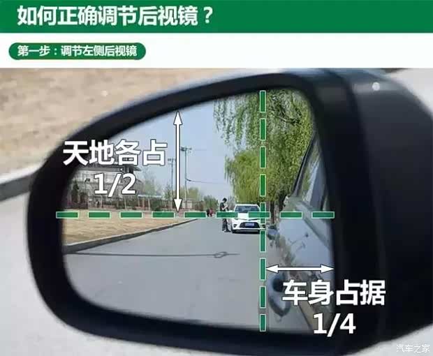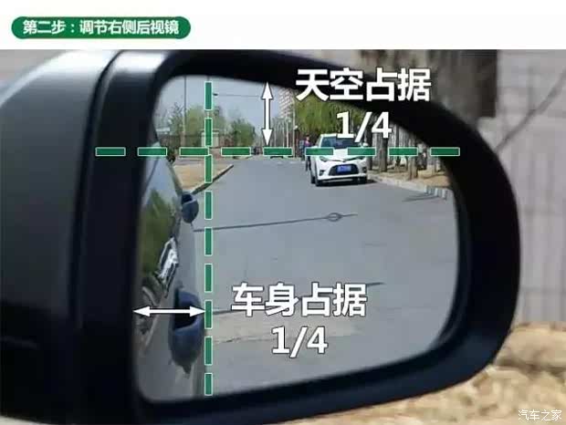 右侧后视镜调整和左侧还是有一定区别的。比如,我们要遵循,天和地4:1的比例来调整!因为你坐在驾驶位上,所看到的效果和左侧看到的效果,肯定是有视觉差的,因此,角度过大反而会影响安全!