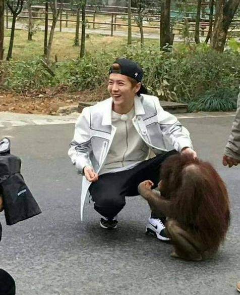 鹿晗竟然牵着一只猩猩的手,画面搞笑又温馨,据说傻狍子牵着猩猩只会哈哈哈,估计是手牵猩猩的感觉太奇妙了吧,哈哈。