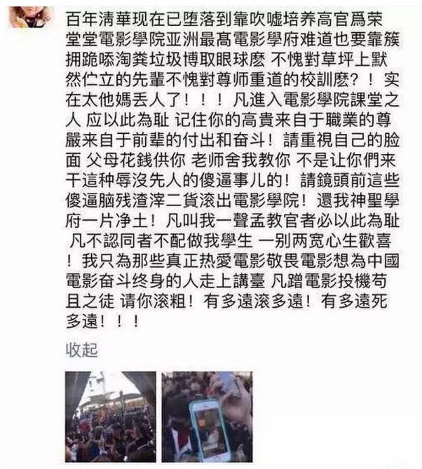 但,留在北电的王俊凯也没有那么幸运,一位北电的孟姓教师愤然发微博,认为这是北电对“掏粪垃圾”的跪舔,也是对百年名校的亵渎,“对那些蹭电影的投机苟且之徒,请你滚粗”。