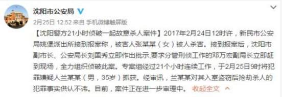25日中午12点52分,沈阳市公安局官方微博消息:2017年2月24日12时许,新民市公安局姚堡派出所接到报案称,被害人张某某(女)被人杀害。接到报案后,沈阳市副市长、公安局长刘国秀立即作出批示,要求分管刑侦工作的邓万宏副局长立即赶到现场,全力组织侦破此案。专案组经过21个小时连续工作,于2月25日9时将犯罪嫌疑人兰某某(男,35岁)抓获。经审讯,兰某某对其入室盗窃后抢劫杀人的犯罪事实供认不讳。目前,案件正在进一步审理中。