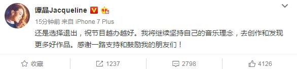 谭晶 凤凰网娱乐讯2月24日,《歌手2017》关于谭晶的视频纷纷下架,名字也被从参赛名单中删除,退出原因风起云涌。2月25日上午,谭晶在网上发文表示:“还是选择退出,祝节目越办越好。我将继续坚持自己的音乐理念,去创作和发现更多好作品。感谢一路支持和鼓励我的朋友们!”