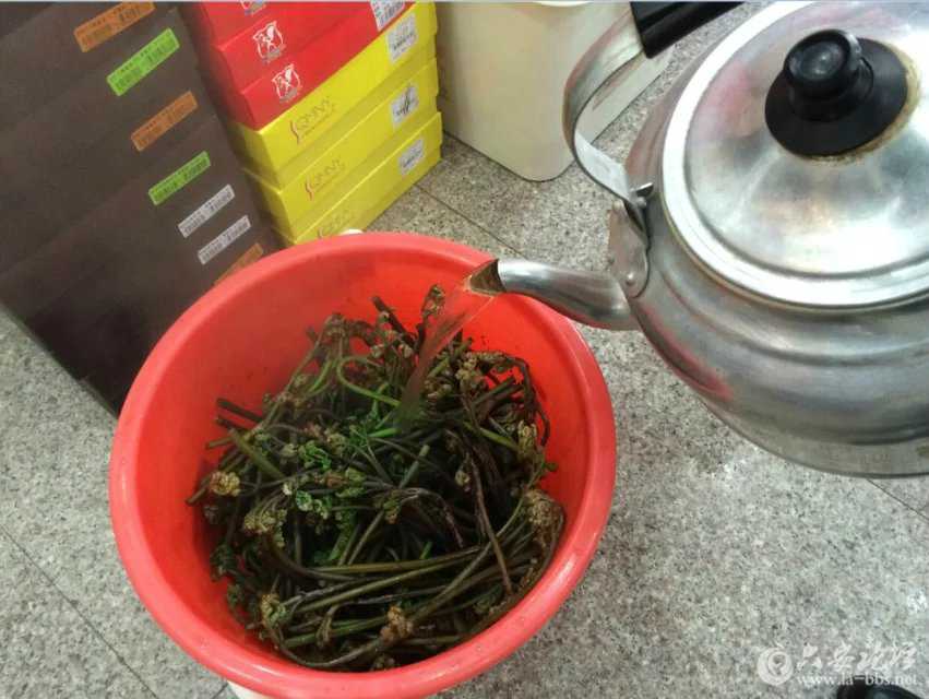 店里没有厨房 房东不在家更不方便借用对方的厨房 但新鲜蕨菜采摘回来第一时间需要焯火断生 时间搁置太久能吃的部分就很少了 没办法 从房东家里拿来水桶与烧水壶 用自己的方法在店里烧水直接烫淋蕨菜 没有办法的办法