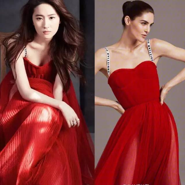 刘亦菲和希拉里·罗达还撞过红色纱裙,红色比裸色适合刘亦菲。