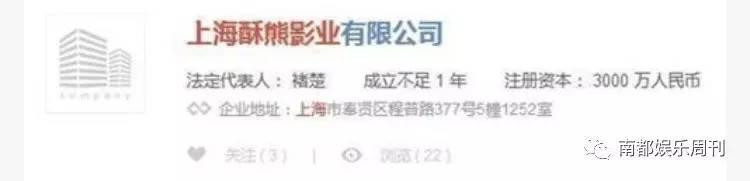 在网上查证的公司信息表明,上海酥熊影业成立不足一年,注册资本为3000万人民币。