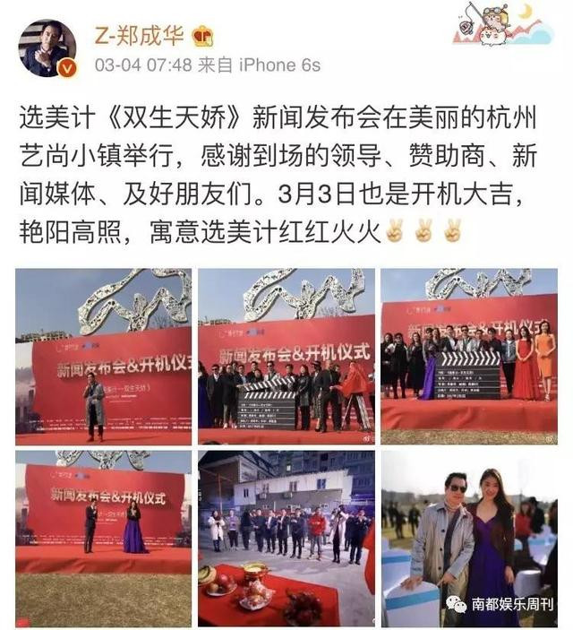 微博原文: 自己选美计《双生天娇》新闻发布会在美丽的杭州艺尚小镇举行,感谢到场的领导、赞助商、新闻媒体、及好朋友们。3月3日也是开机大吉,艳阳高照,寓意选美计红红火火