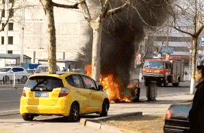 孩子父亲在燃烧的轿车旁