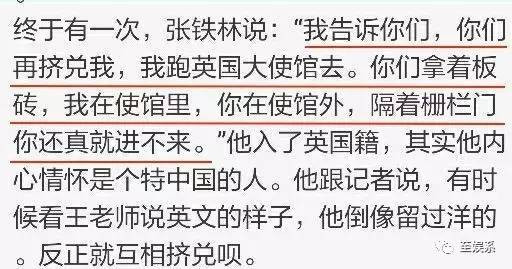 张铁林有时候实在被他们逼急了,就特别「政治不正确地」调侃说自己要到英领馆避难(张铁林为英国籍),隔着铁栅栏看他俩谁能进来。