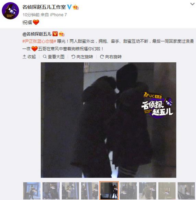 今日,“名侦探赵五儿”爆料称:“#尹正张蓝心恋情# 曝光!两人甜蜜外出,拥抱、牵手、甜蜜互动不断,最后一同回家度过浪漫一夜,五哥在寒风中塞着狗粮祝福你们啦!”