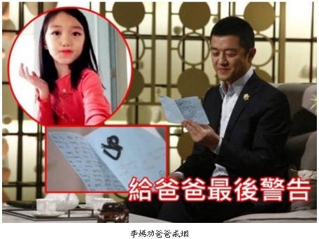 近日,很久没有在电视里露面的李亚鹏,在节目中首度讲述和女儿李嫣在生活中的小故事。谈及近20年来有何转变时他说:“我女儿的到来,给予了我人生最大的变化”。随即将李嫣在情人节亲手给他制作的巧克力当做小礼物送给主持,还首度展示女儿送给他的生日贺卡!卡片中写道:“一天天的过去了,你还在抽烟,每一次抽烟都在伤害你的身体,这是你45岁的生日,我不会再跟你说第二次,我爱你,如果你不抽烟,我会更爱你。”
