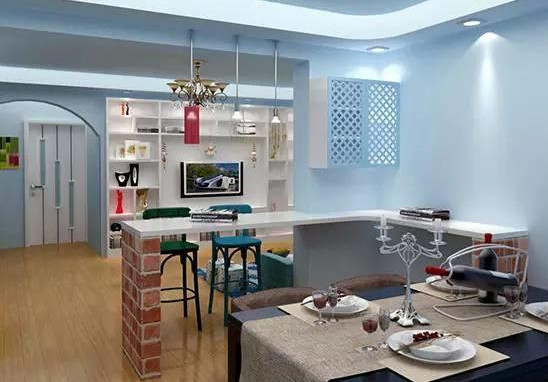2、隔断式吧台隔断式吧台可谓是一物两用,既是隔断又是吧台。在设计位置选择上,可以是客厅和餐厅之间、餐厅和厨房之间等。