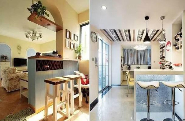 很多家庭都想在家设计一个温馨浪漫小吧台,闲暇时,可以坐在吧台上品品酒或者吃点下午茶什么的,想想都感觉很惬意,若是两人更显浪漫情调。吧台的设计也是多种多样,对于刚需小