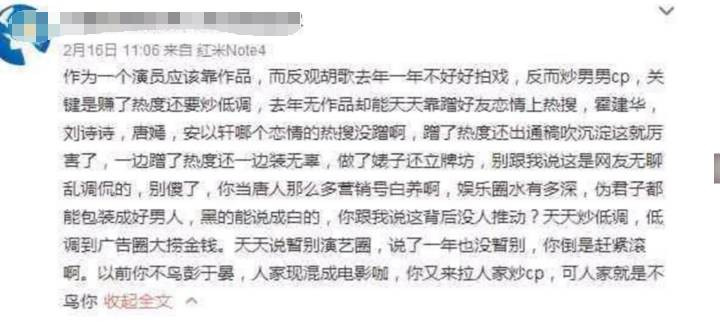 有网友气急败坏地说了一堆,斥责胡歌没作品买热搜,蹭霍建华刘诗诗唐嫣等人的热度,强拉彭于晏组cp等…