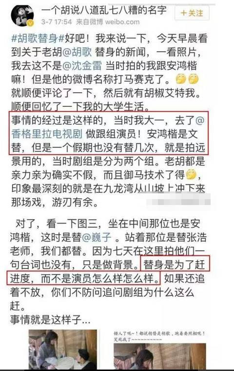 网友七嘴八舌地议论了起来,“辩论赛”太激烈,以至于把替身本人都炸出来了……这位替身演员澄清说,他只是在剧组赶进度时拍了几个远景而已~