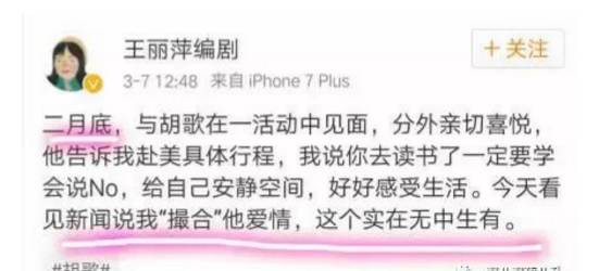胡歌和王晓晨是通过《猎场》认识的,于是有人借此爆料说,编剧王丽萍就是两人的“媒人”……可惜,这个爆料威慑力太弱,分分钟就被王丽萍编剧打脸了!