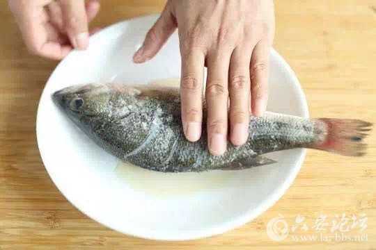 然后开始腌制去腥,用料酒均匀涂抹鱼身,这样有助于去腥,也让肉质保持鲜嫩,大概腌制15-20分钟即可。