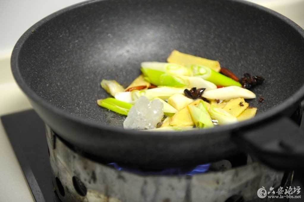 下锅拉,油烧冒蓝烟后,下入配料煸香,火不能太大,主要是炒出香味。