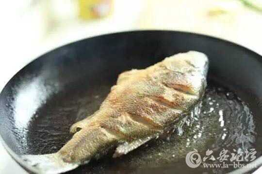快速翻炒几下后盛出,剩余的油用来煎鱼,油温五成热即可,煎至两面金黄。