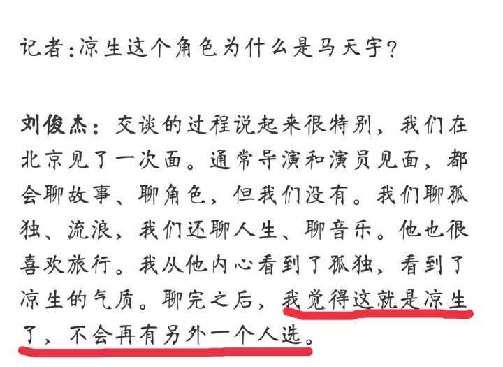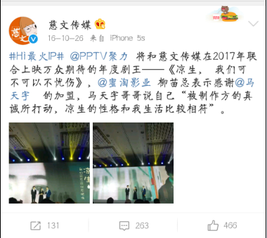 2016年10月26日,聚力传媒和苏宁战略合作发布会上,《凉生》是唯一受邀的剧组,而马天宇作为男主,代表整个凉生剧组参加了发布会。该剧主创人员透漏,此剧在2015年便开始接洽马天宇,邀请其饰演男主凉生。直到16年马天宇档期空下来,以及马天宇本人被制作方的真诚打动,才确定出演男主角凉生。此次发布会上马天宇是唯一一位代表凉生剧组出席的演员,聚力传媒对此剧的重视程度可见一般。