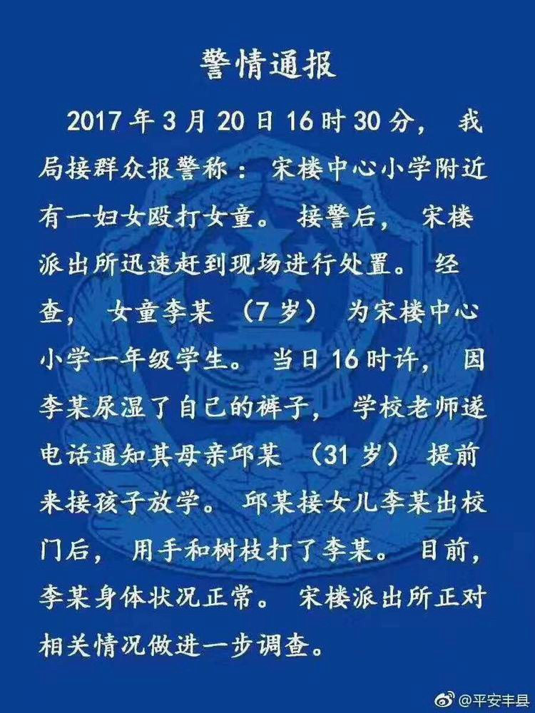 事后,丰县警方连夜发布通报,“3月20日16时30分,我局接群众报警称:宋楼中心小学附近有一妇女殴打女童。接警后,宋楼派出所迅速赶到现场处置。经查,女童李某(7 岁)为宋楼中心小学一年级学生。当日16时许,因李某尿湿了自己裤子,学校老师遂电话通知其母亲邱某(31 岁)提前来接孩子放学。邱某接女儿出校门后,用手和树枝打了李某。目前李某身体状况正常,宋楼派出所正对相关情况做进一步调查。”
