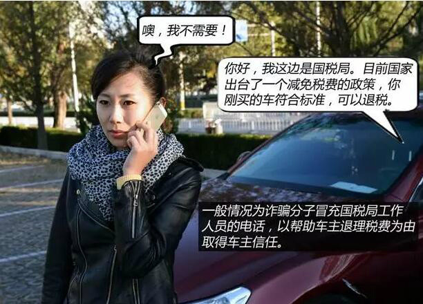 这个骗术经常出现在买新车的时候,会接到自称税务局的电话,告诉你可以退5%车购税的退税政策,只要车主按照联系电话指定的操作步骤就可以办理。由于车主信息被泄露和贩卖,骗子可以掌握你的姓名、电话、车型甚至具体配置等重要个人信息。所以刚买新车接到这种电话的时候,直接挂掉就好。不过,如果你很无聊,可以跟骗子畅谈30分钟之后,再揭穿他,这样比较解气!