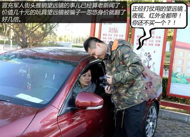 这种卖望远镜的军人大家一定都遇到过,穿着迷彩服或者军装,开着绿色的吉普车,向你兜售军用望远镜。“假冒军人招摇诈骗罪”,会面临三年以下有期徒刑、拘役、管制或者剥夺政治权利;情节严重的,处三年以上十年以下有期徒刑!