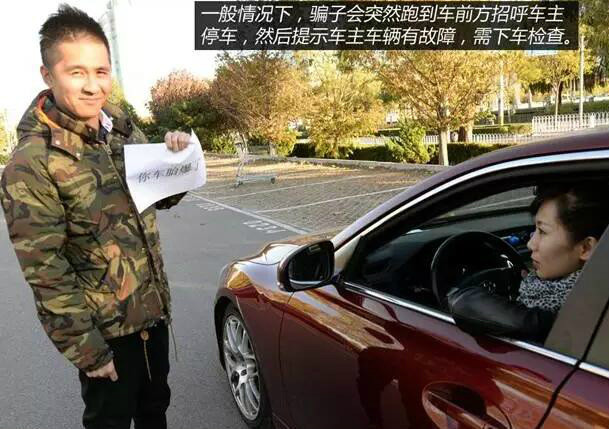 我们在生活中,一定会出现当车辆有故障后被真正的好心人提醒下车检查车况的事情发生,不过当您遇到了好心人时,不妨多个心眼。在下车检查时,看管好车内的财物或直接给车上锁再下车查看!