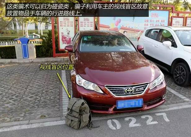 这种骗术会在车主的视线盲区里放置物品,当车辆碰到或碾压到碰瓷物时,骗子借机向车主索要赔偿。