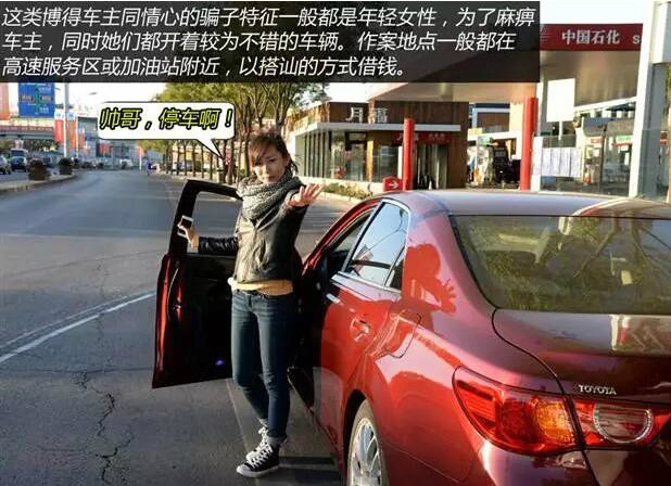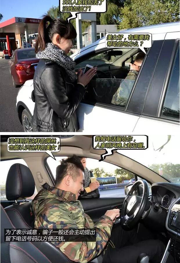 这种骗术相较于前几种,明显动过心思,也花了成本。年轻女性且都开着不错的车,作案地点大多情况下分布在高速服务区或加油站内。她们会通过搭讪的方式向男车主借钱,理由则是自己钱包丢失,没钱加油等等。