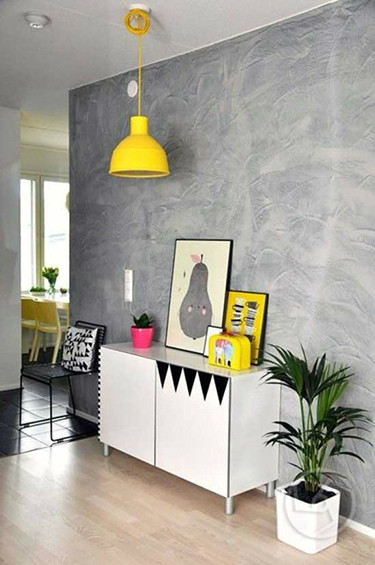 带暗纹的玄关墙,配上趣味的图案装饰,可让中性空间更具有色彩活力。