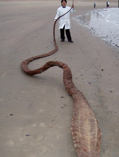 日本一男子在海边游玩时发现了一条巨型干尸,看起来已经死去了很久,据初步估计,这条不明生物足足有十几米长。