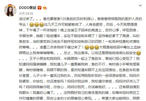今日凌晨4点,曹颖发文说自己在高速上突发心悸,手机发麻,抽筋,还险些撞车,坚持到下了高速以后,曹颖才叫的救护车,之后一轮检查和吃药打针后,才慢慢缓过来。
