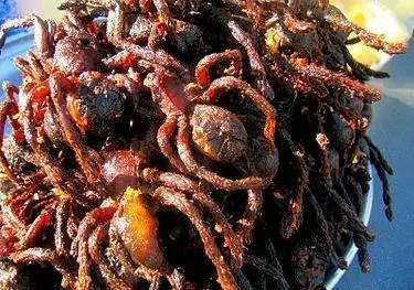 先感叹一声,柬埔寨人民真是心大啊,蜘蛛这玩意儿也能这么玩儿……据说当地人非常喜欢个头大,汁液足的狼蛛。狼蛛在经过高温油炸后会释放出前所未有的焦脆口感,搭配爽口的酸橙汁,与特殊调味的黑胡椒蘸酱,味道非常棒。