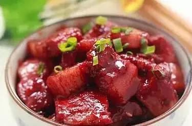 材料:五花肉775克、鸡精、料酒30克、腐乳汁70克、水2000毫升、小葱少许。