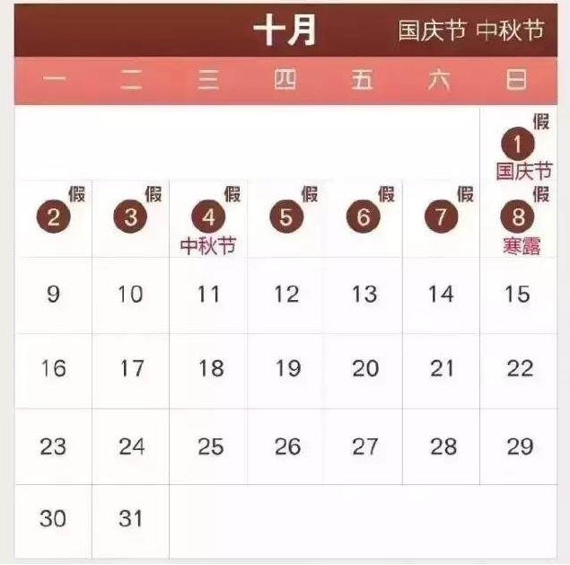 中秋节、国庆节:10月1日至10月8日放假调休,共8天。9月30日(星期六)上班。