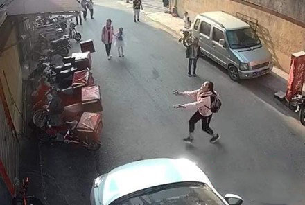 楼上发生了什么?引得一大早上学的学生驻足观看?就在女孩再次进入监控画面大概5秒之后,视频中显示,这名背着书包的小女孩突然伸出双手做托接的姿势向前跑了几步,而就在这一瞬间,一名娃娃从高处坠入监控画面当中,擦碰到两辆送餐车的送餐箱坠落水泥地面。