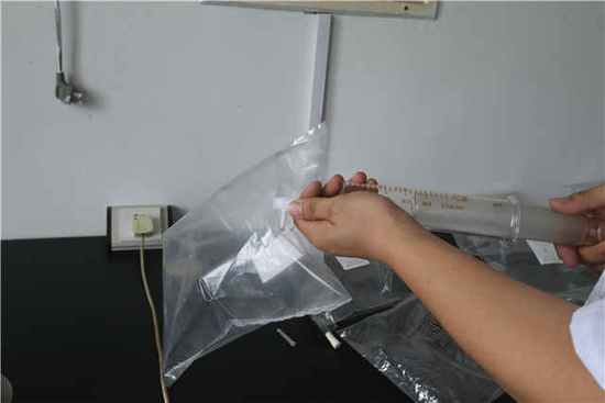 第一次稀释,配气的嗅辨员准备了18个嗅辨袋,每3个一组,共6组。嗅辨员先将18个嗅辨袋分别充入3升洁净空气,然后抽取100毫升样品臭气,注入每组3个嗅辨袋中的1个。