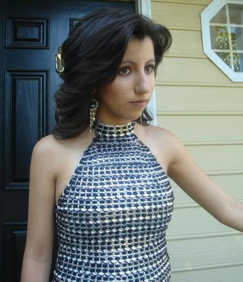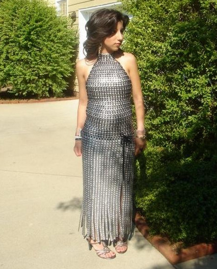 女孩没有搭理她们,依然继续搜集,在拉环足够之后,女孩开始制作属于她自己的礼服,6300个易拉罐拉环穿在自己的身上,既精致又引人注目。