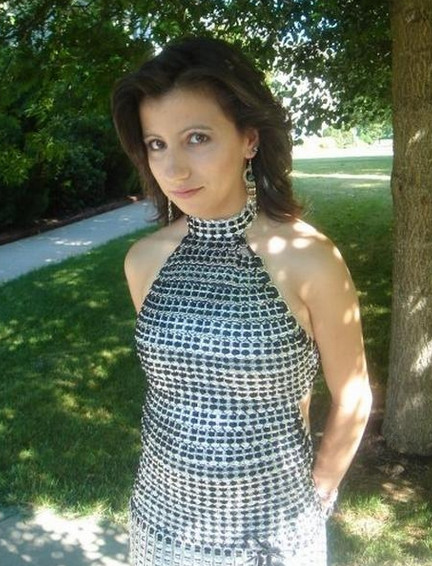 图中的女子身上所穿的礼服看起来挺精致,在阳光下还闪烁着光芒,其实,这件礼服是由6300多个易拉罐的拉环制作而成。