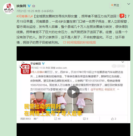 [全城朋友圈转发寻找失踪女童 ,拐带者不堪压力当天送回!]