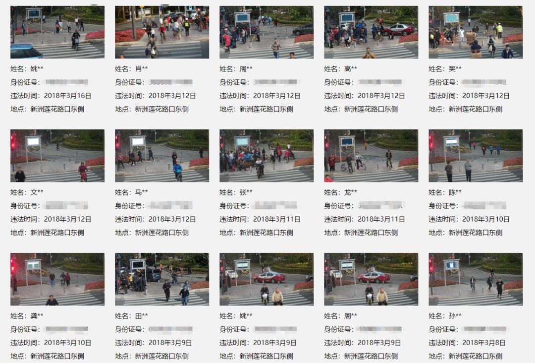 “行人过马路闯红灯曝光台”网页截图。身份证信息已作处理,原页面中,身份证号部分隐去第7-9位。