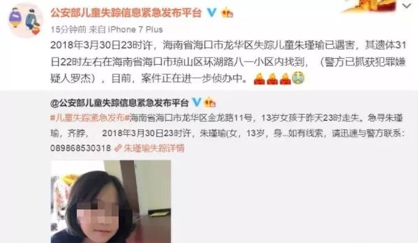 记者4月1日从海口警方获悉,今年年仅13岁的海口失联女孩朱某某确认遇害,犯罪嫌疑人罗某已被警方抓获归案。
