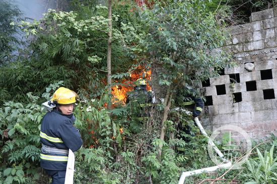 昨天傍晚7点17分,巫溪县消防大队马镇坝消防中队到场后发现,火苗顺着竹叶冒出冲天火光,火势正在慢慢扩大。由于竹林靠近一个居民区,如果火势继续蔓延,会给居民造成影响。消防队员立即接起水带,出水控制火势。10分钟后,竹林内的明火被完全扑灭,好在被烧毁的竹林只有20平方米左右,没有对周围造成影响。