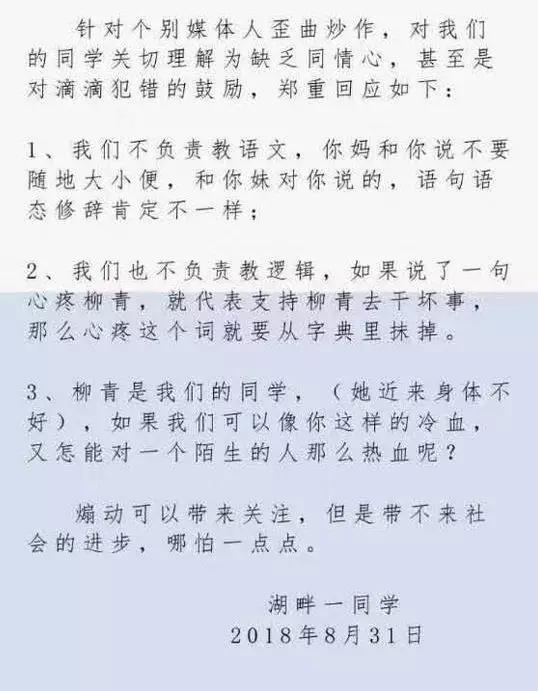 接着,其他的“湖畔同学”跟风说道:“柳青加油”“我们都在,加油!”“柳青加油,会越来越好的”。 截图被公开传播之后,吃瓜群众一看,这还了得。滴滴有问题在先,你们这些同学竟然帮亲不帮理,岂有此理?于是说着说着,从滴滴说到湖畔大学,从湖畔大学说到天安社,就有了文章开头那句话。 2、将同学群对柳青的安慰上升为同情滴滴是上纲上线 “天安社是下等人的湖畔大学,湖畔大学是上等人的天安社”,这句看似工整、精辟、一阵见血的话,其实未必经得起推敲。 先说那个截图。大家对这种抱团现象的反感我可以理解。顺风车杀人案滴滴的问题有目共睹,而柳青作为滴滴总裁当然要承担责任。你们都心疼柳青,谁来心疼受害人家属?这是人们的本能反应。 但我们不该忽略,在同学群里发言不能等同于公开发言。我很好奇这个截图是怎么流出来的,说实话,这样的行为很不合适。 群内事,群内了。我认为这是社交媒体时代最起码的道义。 当然,在特定情况下,如果发言者触到了人性与良知的底线,晒出来也无可厚非,比如前几天一些滴滴群出现侮辱乐清遇害女孩的言论,把他们揪出来就大快人心。但湖畔同学群显然不属此列。 如果抛弃先入为主的印象,我们应该承认,在一个同学群内,存在私人交往,有这样针对个人的表态,也在情理之中。即便有同学表示“心疼柳青”“柳青加油”,也并不等同于支持滴滴“作恶”,支持柳青继续犯错。这些话可能还包含鼓励她勇敢改错的意思。 而这种圈内人的对话被外传之后,起初的语境便被破坏了。 使事情进一步陷入混乱的是,网上现在又出现了一份所谓“湖畔同学”的回应,说什么“我们不负责教语文……也不负责教逻辑”。这份回应不知是真是假,如果真出自湖畔大学学员,那只会火上浇油。