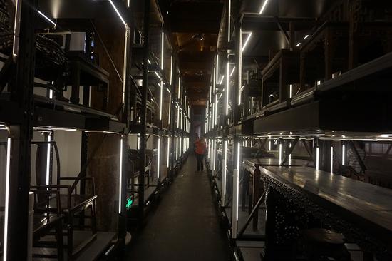 故宫博物院单霁翔院长对“澎湃新闻”介绍说,故宫家具文物中不少是收藏在地面库房中,空间拥挤,保存条件欠佳。而且由于院内很多殿宇均进行原状陈列展示,展出家具形式和内容比较固定,因此大量不在展线上的明清家具难见天日,而“仓储式”展陈正是缓解库存压力、给库存文物更多亮相机会的有效手段。通过南大库的“仓储式”展陈,可以使古建筑得到更好的修缮和利用,家具文物得到更好的整理、保护和展示,也让观众欣赏到宫廷家具用料之考究、设计之精美、内涵之丰富,让“故宫行”再加一个不得不去的“新看点”。 “澎湃新闻·古代艺术”(www.thepaper.cn)获悉,根据展览规划,家具馆共分三期展厅,一、二期位于南大库区域,三期位于南薰殿区域,将汇集2000多件明清家具,既是库房又是展馆。家具馆二期将全部为仓储式展示,三期则主要展示明代家具。未来可能以轮换展示形式,让更多家具珍品与观众见面。在全部布展完成后,三期展厅将实现连通,并与武英殿和宝蕴楼共同形成新的展示区。  故宫家居馆展厅中的“原景重现”