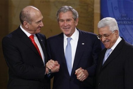 2007年11月27日,美国总统布什(中)、以色列总理奥尔默特(左)和巴勒斯坦民族权力机构主席阿巴斯在巴以和平会议上亲切握手。Jim Young摄。