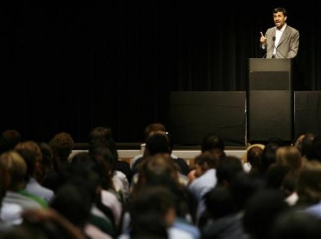 9月24日,伊朗总统内贾德在纽约哥伦比亚大学发表演讲。Shannon Stapleton摄。