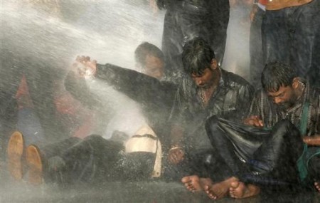 11月25日,抗议种族歧视的示威者遭到马来西亚防暴JC的水炮袭击。Bazuki