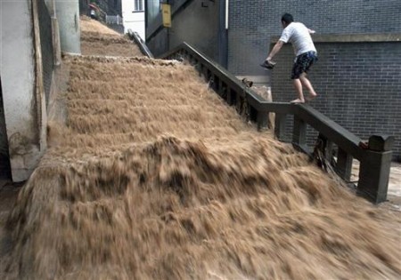 7月17日,重庆市街头洪水泛滥,人们不得不走在楼梯扶手上。中国日报摄。